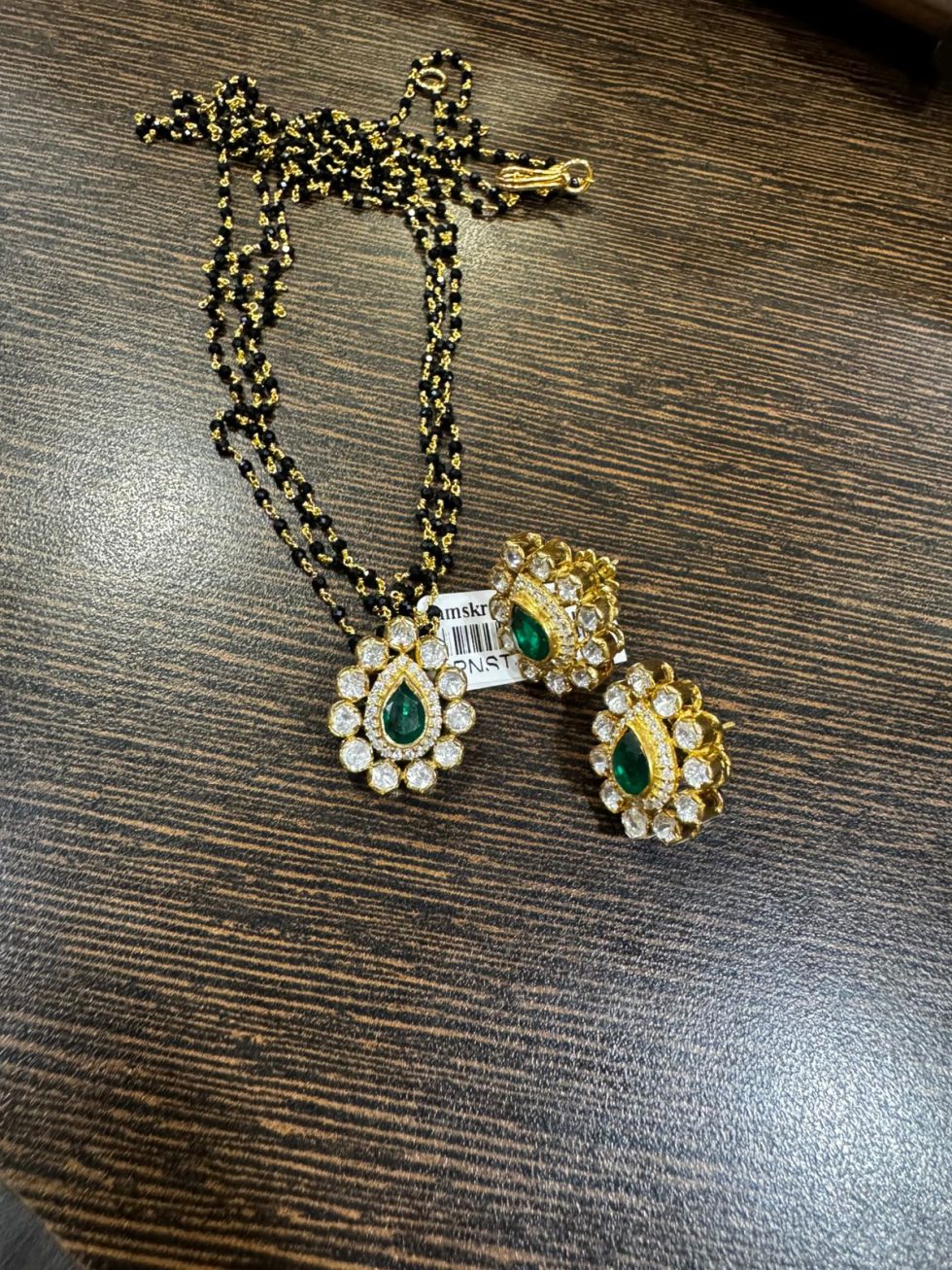 925 silver 22 carat gold plated pendant with czs, moissanites , semi precious emerald stone pendant with three layered crystal black beads and earrings