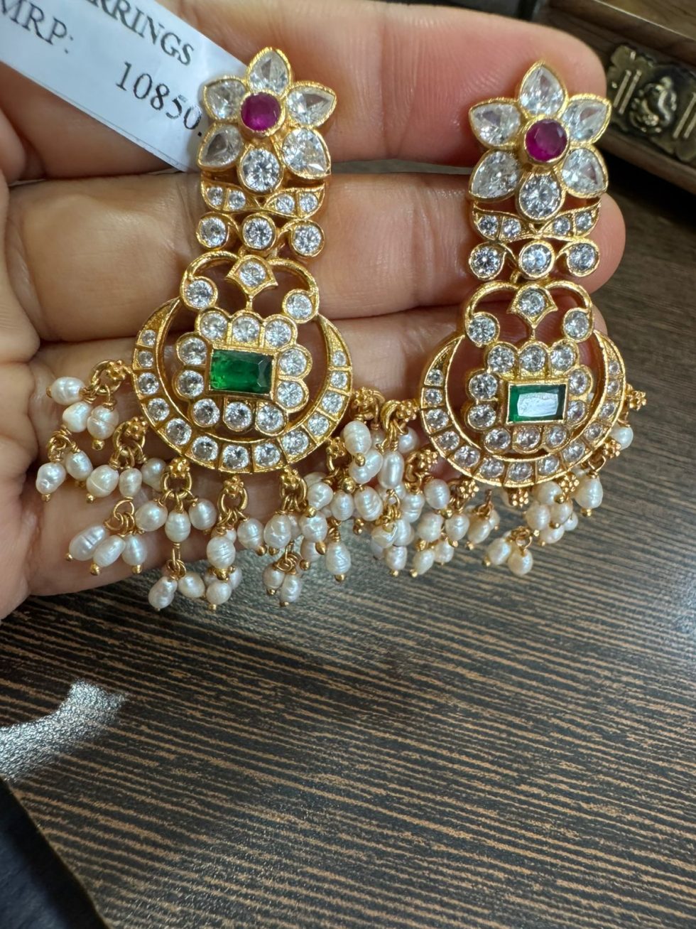 925 silver 22 carat gold plated earrings with czs , semi precious emerald , ruby stones and real rice pearls screw style earrings