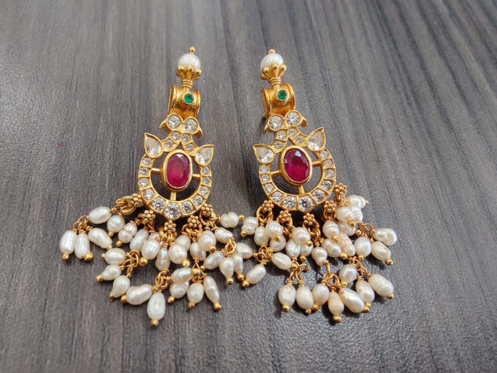 925 silver 22 carat gold plated earrings with czs , semi precious emerald , ruby stones and real rice pearls screw style earrings