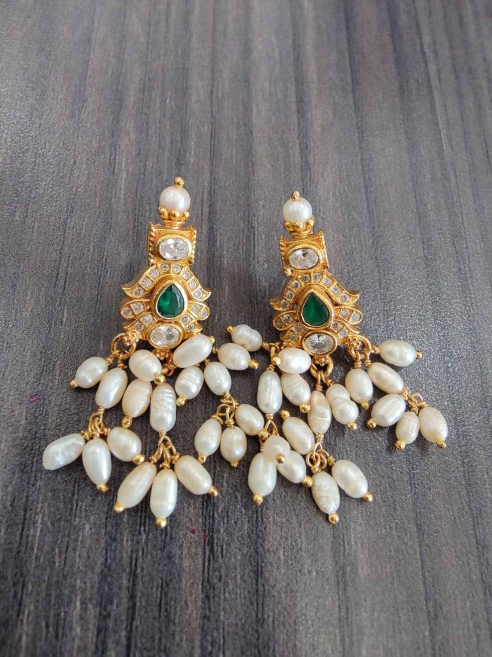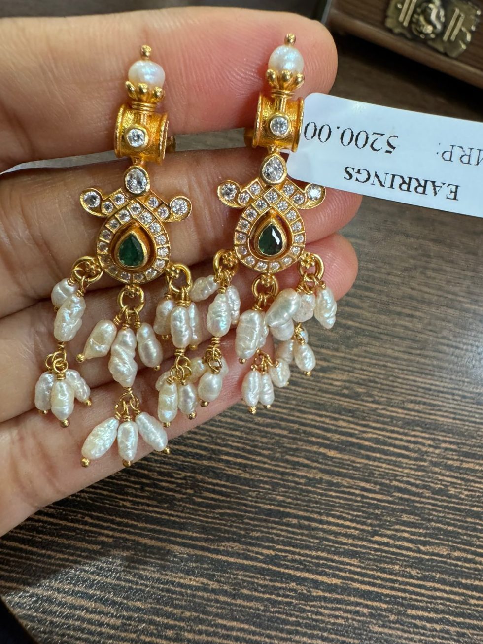 925 silver 22 carat gold plated earrings with czs , semi precious emerald stones and real rice pearls screw style earrings