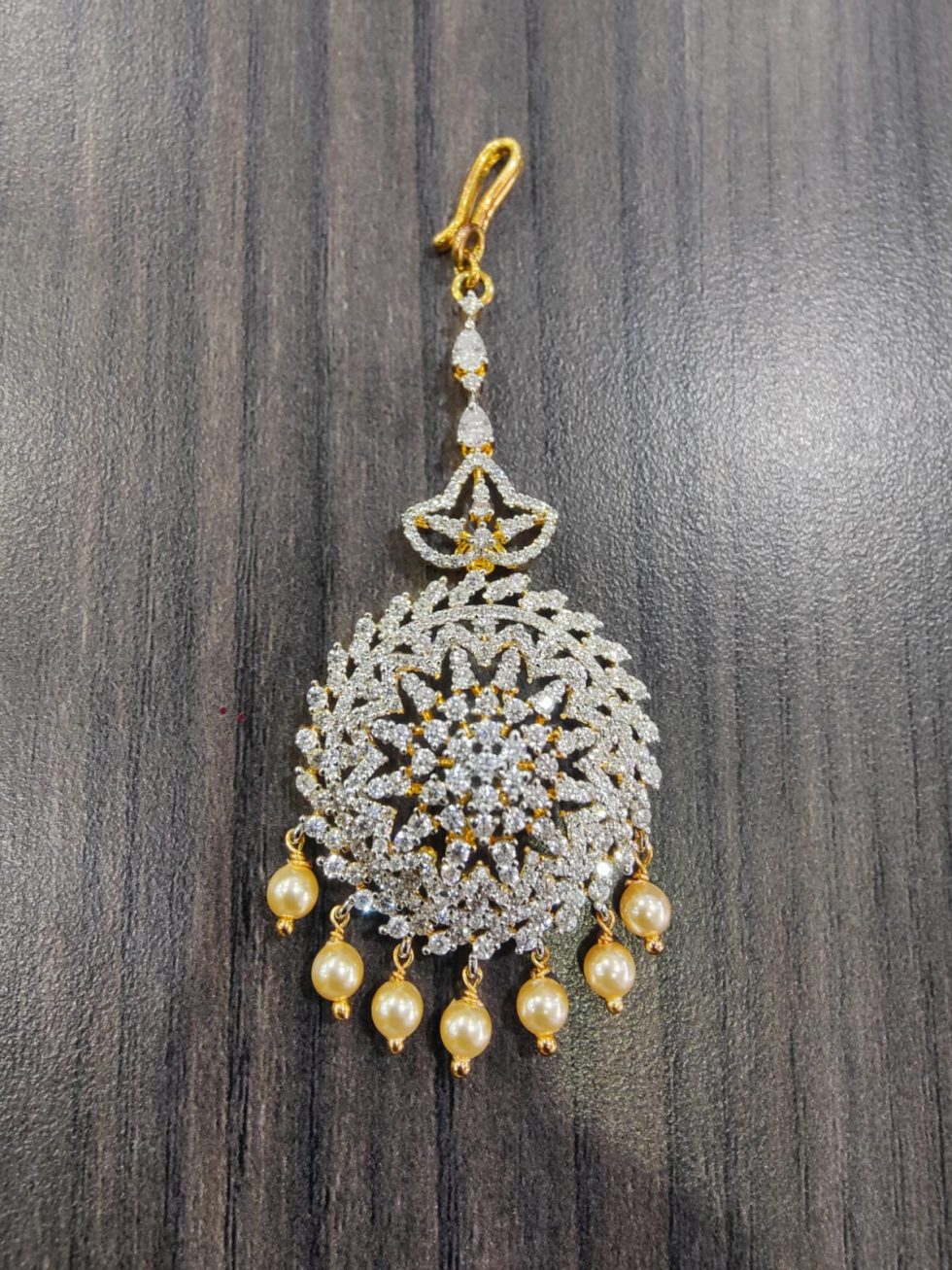 925 silver 22 carat gold plated diamond finish mang tikka with cubic zirconia stones and swarovski pearls mang tikka