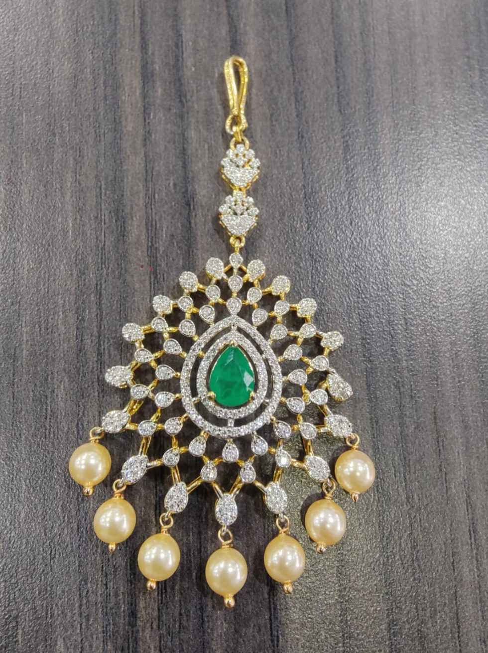 925 silver 22 carat gold plated diamond finish mang tikka with cubic zirconia stones ,semi precious emerald stone and swarovski pearls mang tikka