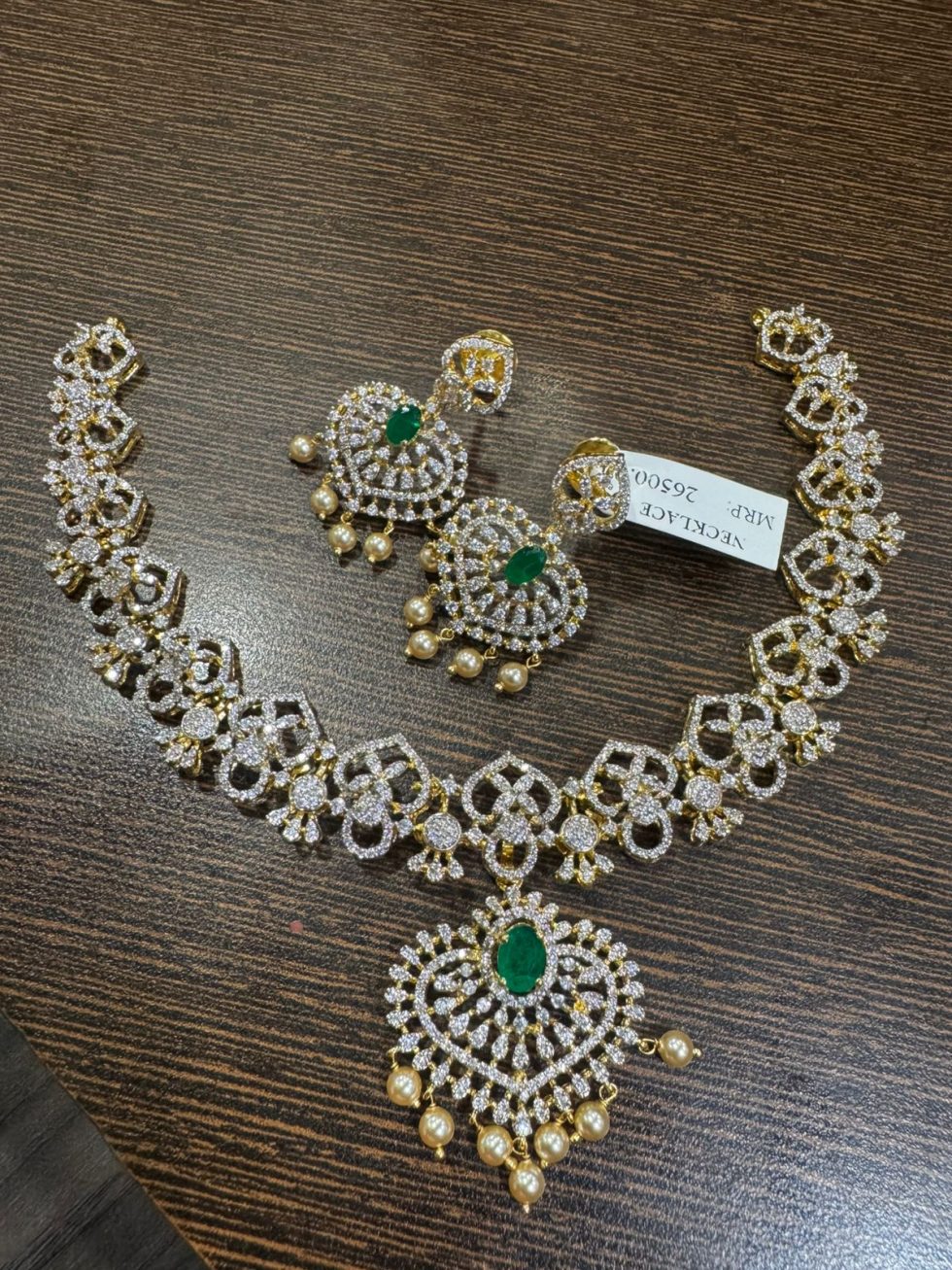 925 silver 22 carat gold plated diamond finish necklace with czs , and semi precious emerald stone detachable pendant necklace and screw style earrings