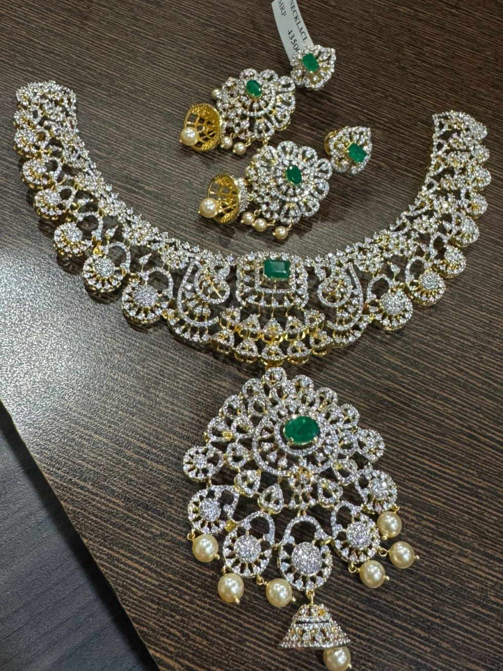 925 silver 22 carat gold plated diamond finish necklace with czs , and semi precious emerald stone detachable pendant necklace and screw style earrings