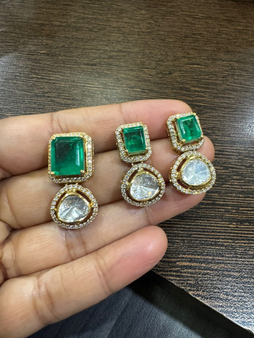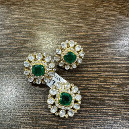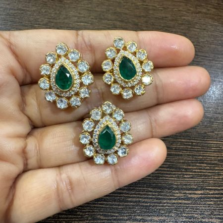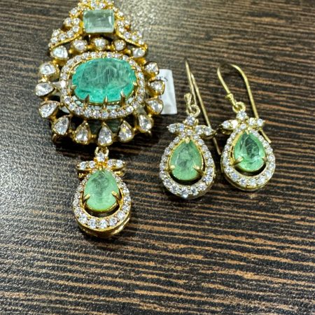 925 silver 22 carat gold plated pendant with czs, moissanites and semi precious emerald stone pendant and screw style earrings